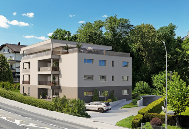 Ein leiser, rollstuhlgängiger Lift erschliesst alle Geschosse, in der Attika direkt bis zur Wohnung. Die Umgebung wird ansprechend mit Plattenbelägen, Begrünung und IV-gerechten Parkplätzen gestaltet.
